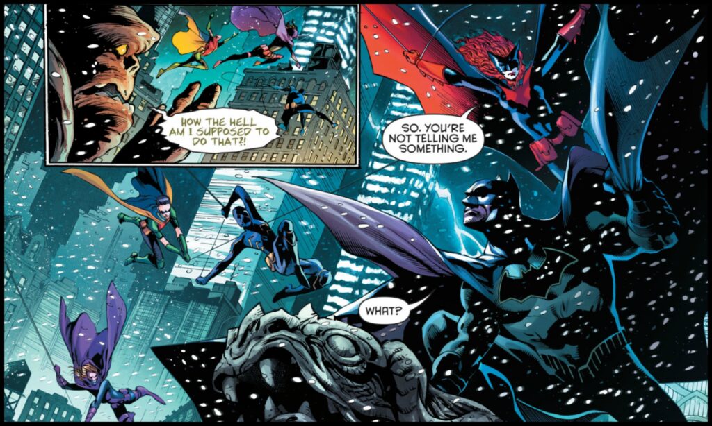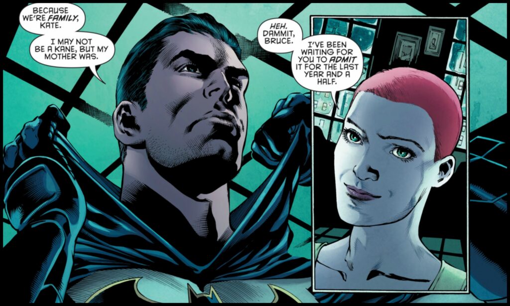 Kate wraca do mieszkania, gdzie czeka na nią Batman. Choć na początku atakuje go, biorąc za włamywacza, to szybko opanowują sytuację. Mroczny Rycerz opowiada Batwoman o wydarzeniach z ostatniego czasu i o samym Azraelu, który wyzwolony spod wpływu Zakonu św. Dumasa próbuje odkupić swoje winy. Z jego zapisków wynikało, że czuł się śledzony, a jakaś wielka konspiracja właśnie miała miejsce w Gotham. Na domiar złego śledzące ich drony są jedynie częścią „roju” i ponad obecne możliwości techniczne. Batman zdradza Batwoman, że drony okazały się śledzić większość bohaterów Gotham. Prosi Kate o pomoc w wytrenowaniu rekrutów i zdradza jej swoją tożsamość, bo komu ma zaufać, jeśli nie rodzinie (Bruce jest spokrewniony z Kate od strony matki). Kate przyznaje, że wiedziała o tym, kto ukrywa się pod maską Batmana – w końcu są kuzynami.