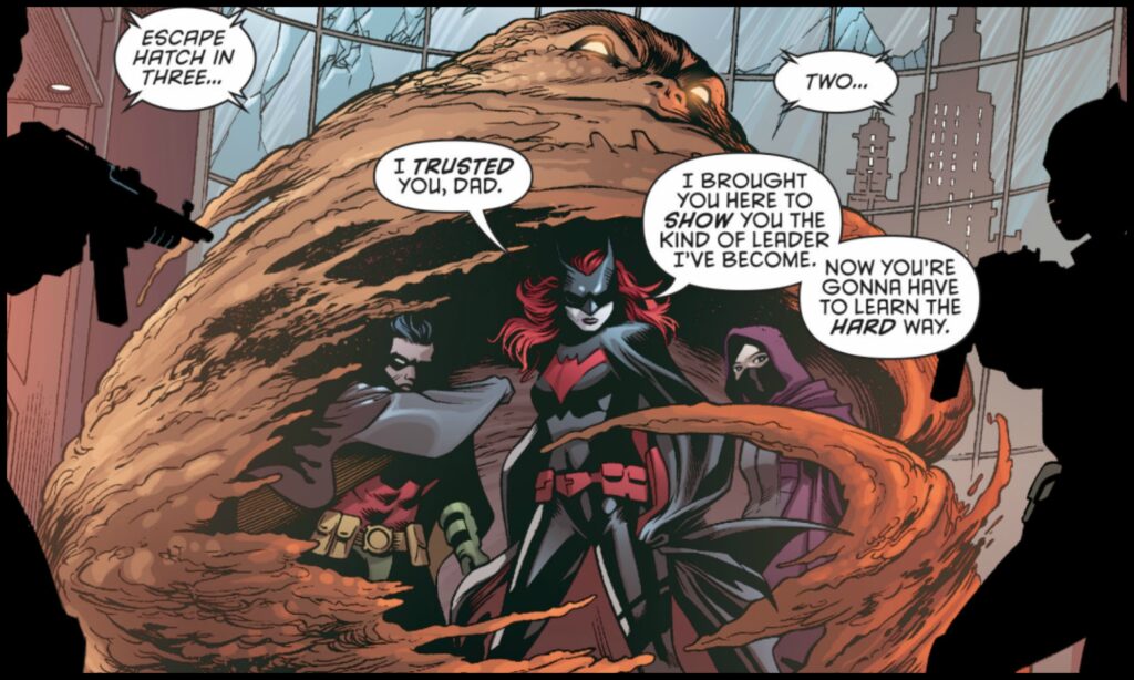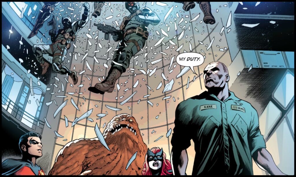 Na szczęście żołnierze jedynie usypiają Orphan. Tim wpada na pomysł: Batwoman ma zagadać swojego ojca a on w tym czasie spróbuje shackować sieć wojskowych. Córka sprawia, że ojcu rozwiązuje się język. Generał jest zdania, że idea Batmana jest potężna, ale źle ukierunkowana. Nie zbrodnia jest problemem ale „coś większego”, a armia batżołnierzy walczy na większą skalę, niż Batman kiedykolwiek byłby w stanie. Kane proponuje córce dołączenie do siebie (odwołując się do jej wojskowych korzeni), oraz wzięcie rekrutów do dalszego treningu. W tym momencie Tim włamuje się do sieci Generała, która… okazuje się być pułapką. Red Robin właśnie oddał Kane’owi kody do batkomputera.