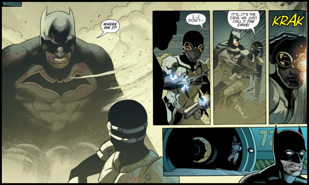 Batman wraca do jaskini, rozmawiając z Alfredem przez komunikator. Mroczny Rycerz wskazuje na możliwość wspierania tajemniczego wroga przez wojsko, ze względu na zaawansowaną technologię, gdy okazuje się, że jest ścigany. Napastnicy unieruchamiają batmobil ładunkiem EMP, a pojazd rozbija się na ścianie. Okazuje się, że za atakiem stoją żołnierze w strojach podobnych do Batmana.