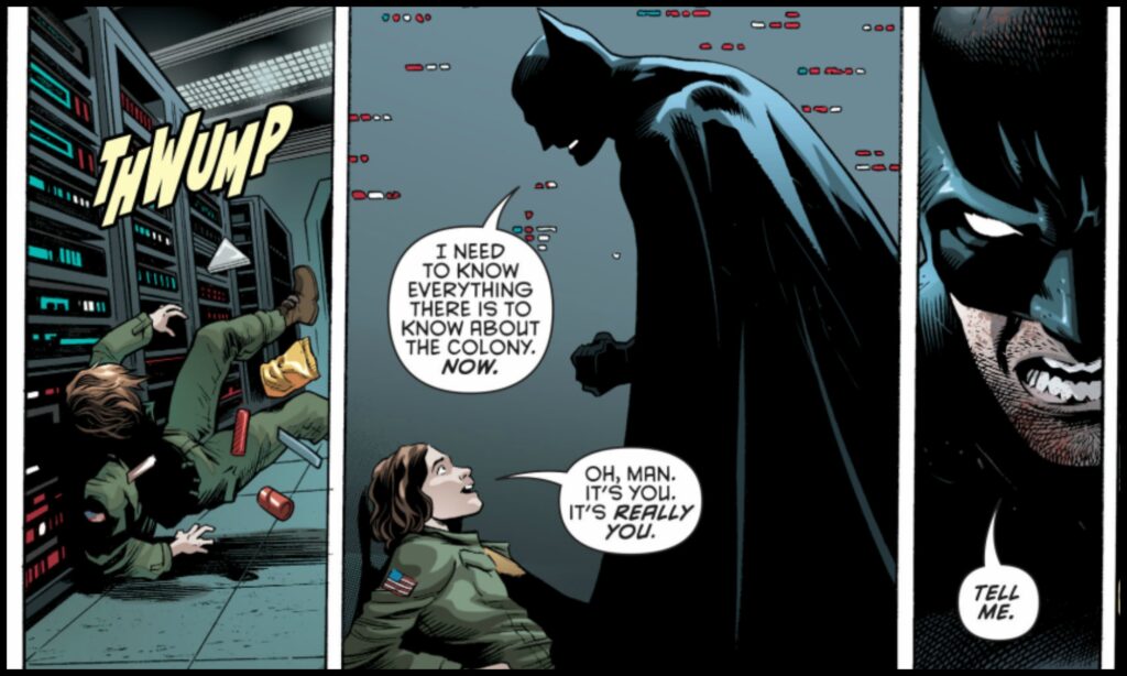 Batman budzi się pojmany w bazie Kolonii. Jego uwięzienie nie trwa jednak długo, gdyż szybko uwalnia się za pomocą granatu dymnego w zębie.