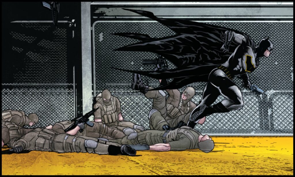 Batman nadlatuje nad Santa Prisca swoim odrzutowcem, żądając przez radio wypuszczenia Psycho Pirate’a przez Bane’a, bo w innym wypadku Batman połami mu kręgosłup. Ostrzeżenia patroli nie zatrzymują Mrocznego Rycerza i po walce w powietrzu zostaje on zestrzelony nad wyspą. Tam czeka na niego komitet powitalny w postaci oddziału Bane’a. Choć Zamaskowany Krzyżowiec stawia zacięty opór, dziesiątki a nawet setki żołnierzy zalewają go i w konsekwencji doprowadzają przed oblicze Bane’a. Ten zadając Batmanowi sporadyczne ciosy informuje go o tym, że złamał międzynarodowe prawa i Liga Sprawiedliwości mu tutaj nie pomoże.