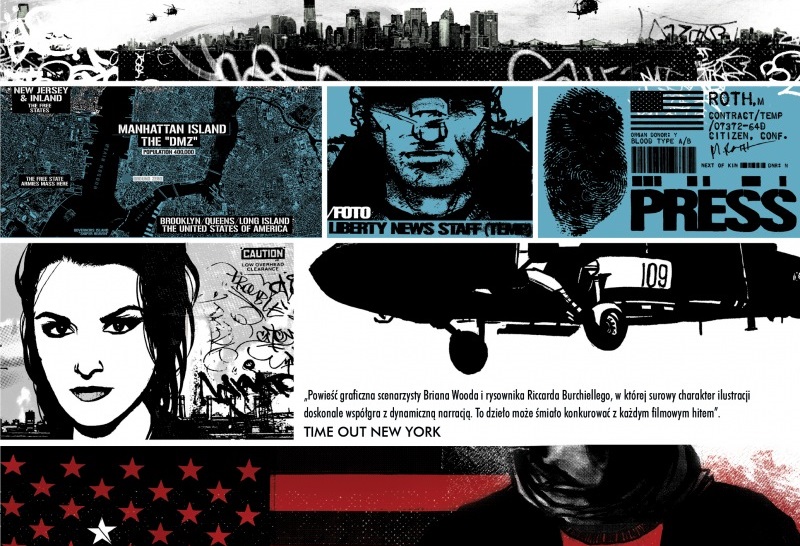 Manhattan kojarzony jest ze światowym centrum biznesu i kultury. Drapaczami chmur, wielokulturowością i nieustannym miejskim zgiełkiem. W komiksie Briana Wooda „DMZ Strefa Zdemilitaryzowana tom 1” na szczególnie ludna wyspa to teren sporny dwóch zwalczających się stron wojny domowej, jaka wybuchła w USA. Po jednej stronie mamy rząd w Waszyngtonie, a po drugiej zbuntowanych obywateli, niezadowolonych z decyzji władz, kryjących się pod nazwą Wolnych Stanów. Kraj jest podzielony, a najbardziej gorącą strefą jest właśnie Manhattan. W sam środek wydarzeń trafia początkujący fotoreporter Matty Roth, który zrządzeniem losu zostaje jedynym dziennikarzem z ekipy. Brak doświadczenia od teraz jest jego najmniejszym problemem. Od teraz jest jedynym oknem na świat mieszkanców DMZ, dzięki któremu świat ma szansę poznać prawdę nieocenzurowana przez którąkolwiek stronę.