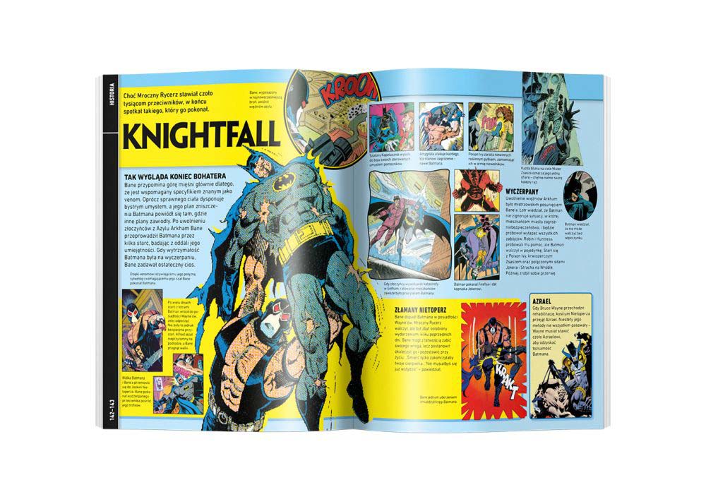 Każde losy komiksowe Batmana ułożono w szablonowy sposób, koncentrując się na najważniejszych wydarzeniach lub postaciach w danym okresie. Na wstępie widzimy nagłówek na całą stronę, na następnej krótki opis. Potem dużych rozmiarów dwustronna okładka. Następnie idziemy za rączką i połykamy kolejne informacje, które w kilku zdaniach przybliżą postacie lub wydarzenia. Opisy sprawdzają się jako zajawki, które przybliżą nam bardzo skrótowo o czym jest dany segment, możliwe że zachęcając nas do dokładniejszego obadania we własnym zakresie. W tej części moimi ulubionymi rozwiązaniami były opis konkretnych komiksów sporządzane na dwóch stronach; na pierwszej konkretne informacje techniczne jak okładka, tytuł, data wydania, twórcy, występujące postacie czy konktekst. Druga strona w formie pełnego streszczenia akcji (pełnego na stronę) z przypisami odnoszącymi się do wybranych kadrów komiksowych.