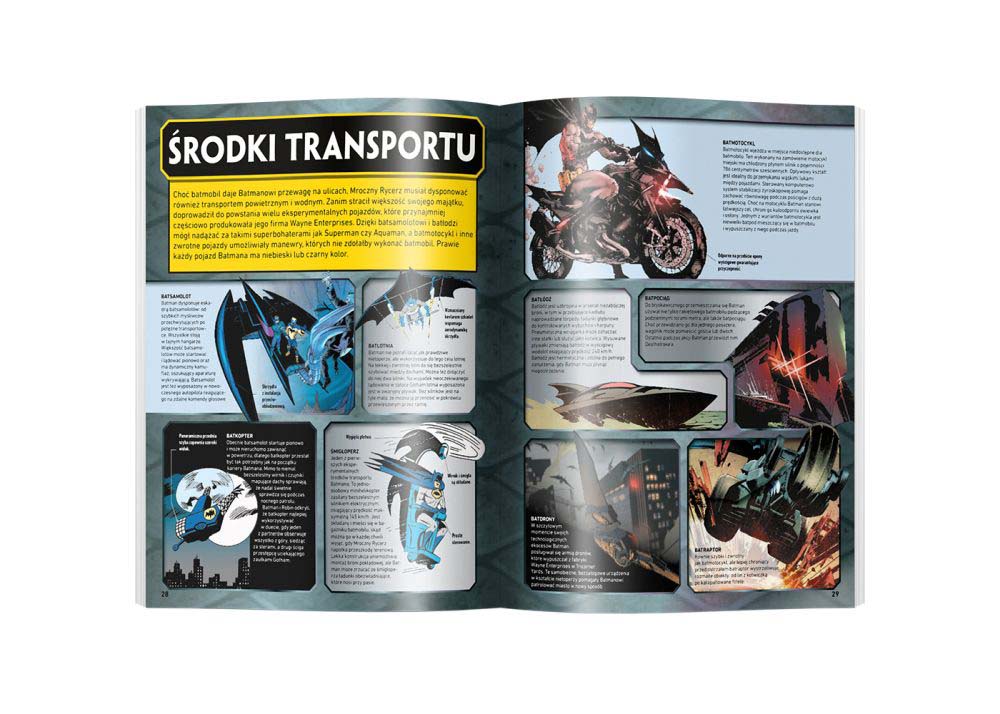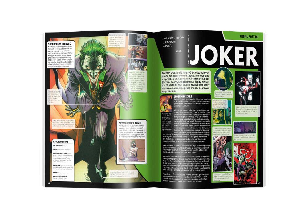 Następne kilkadziesiąt stron przybliża nam elementy światu Batmana: od elementów wyposażenia, po miejsce zamieszania aż połykamy galerie sojuszników i łotrów. Autorzy posługiwali się komiksowymi kadrami przy wizualizacji przeciwników, choć przy elementach wyposażenia pojawiły się autorskie grafiki lepiej pokazującymi konkretne komponenty. Zasób informacji na podobnym poziomie jak wcześniej. Kilka zdań na każdy temat. Kilka konkretnych zdań, które powiedzą te najważniejsze fakty, po których będziemy co nieco wiedzieć o postaciach. Informacje cenniejsze dla nowych czytelników, dla starszych forma ciekawostki lub mocnego streszczenia, które może pobudzić szare komórki i rozjaśnić pamięć.