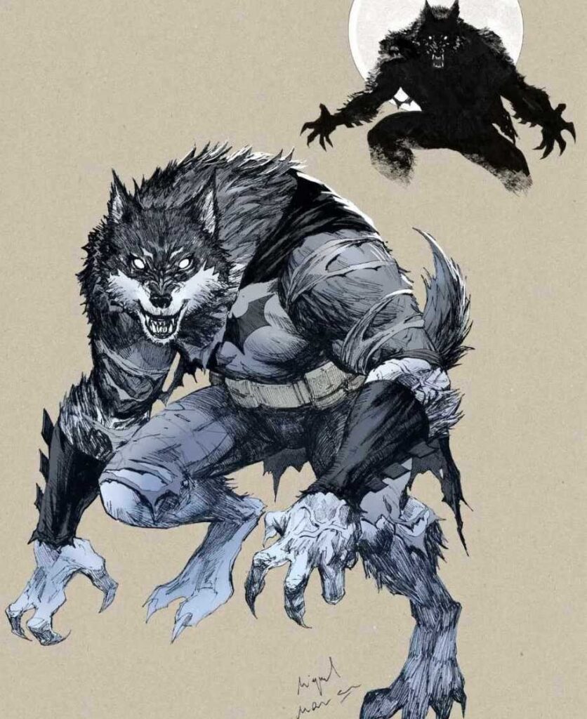 Batman będzie „wilkołakiem”? Zwierzęcą przemianę sugerują prace (szkic + okładka) udostępnione przez Miguela Mendonca do „Titans Beast World. Gotham #1”.
