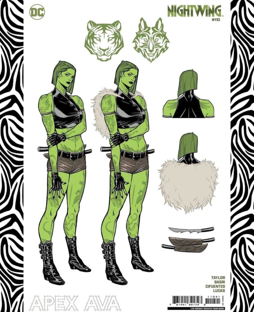 Apex Ava pierwszy raz pojawi się w „Nightwing #109”, ale pełnoprawnym debiut przypada na „Nightwing #110”. Scenarzysta nie ujawnił więcej szczegółów, ale wiele wskazuje na to (choćby jej tatuaże), że moce będą pokrewne z Beast Boyem.