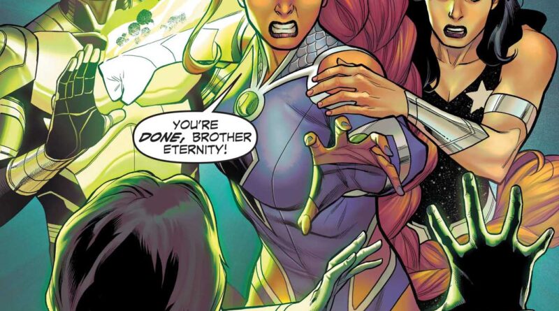 Czy pamiętacie, że „Beast World” rozpoczął się kosmiczną ekspedycją ekipy Brother Eternity? Po tej akcji Eternity zniknął na jakiś czas. Wrócił w „Titans #6” prowadząc szturm na wieżę Tytanów. Towarzyszył mu Garth, który użył specjalnej mocy (skąd ma te lasery?) zniszczył barierę. Pod koniec zeszytu dochodzi do jego szarpaniny z Starfire. I tu mamy ważny zwrot akcji, ponieważ okazuje się, że ludzki wygląd Brother Eternity jest wyłącznie przykrywką. Tak na prawdę to Luand’r!