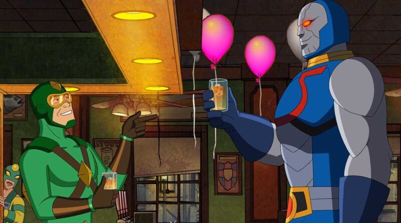 Mroczny władca Apokolips zaskakuje swoją towarzyskością i luzem – jest tak zrelaksowany, że chętnie stawia kolejkę, gdy usłyszy dobre wieści, a nawet potrafi rzucić dowcipem (wyraźnie inspirowany „Mister Miracle” Toma Kinga). Całość dopełnia imponujący chórek zapowiadający jego nadejście (powalająca scena). Twórcy skutecznie przełamali wizerunek Darkseida i umiejętnie wpasowali go w ramy serialu, doskonała parodia.