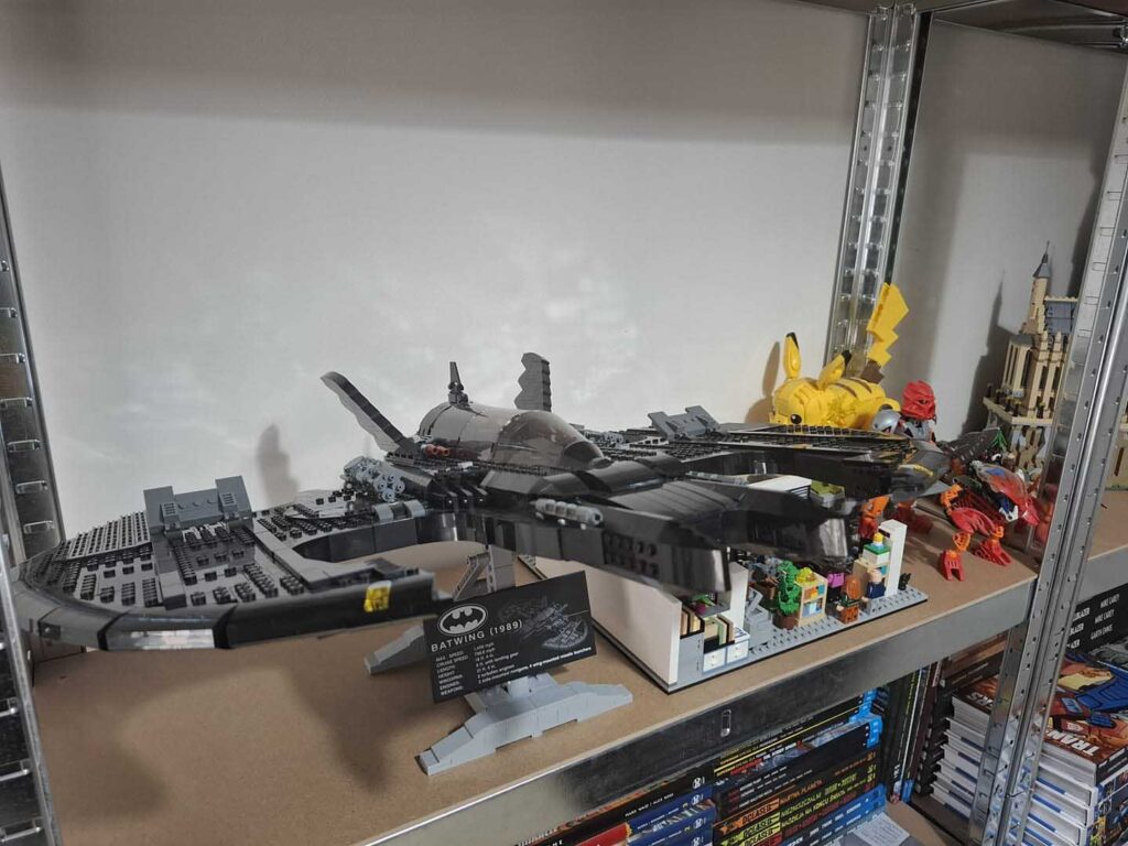 Zestaw zajmuje sporo miejsca na półce, muszę na chwilę powstrzymać od kolejnych zakupów LEGO. Ale dzięki dołączonej podstawce można go łatwo umieścić na regale, ponieważ unosi się kilkanaście centymetrów „w powietrzu” z możliwością regulacji kąta (można go też przymocować do ściany). Podstawka zawiera tabliczkę z informacjami o pojeździe z filmu (spoko smaczek). W zestawie są też trzy figurki, z czego Batman robi największe wrażenie – efekt robi gumowa peleryna połączona z maską.