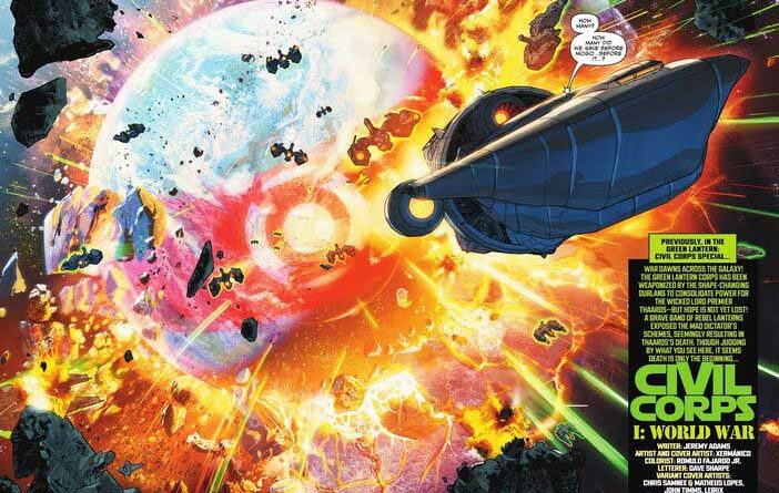 Komiks otwiera się dramatyczną sceną, w której nowa Czerwona Latarnia – Mogo – dokonuje masakry, niszcząc planetę Thanagar i zabijając miliony istnień! Bez wątpienia to jedno z najpotężniejszych i najmroczniejszych wydarzeń w kontinuum DC ostatnich miesięcy, które wyznacza nowy poziom dramaturgii w „Green Lanterns” Adamsa, a jego skutki będą (mam taką nadzieję) odczuwalne przez kolejne miesiące!