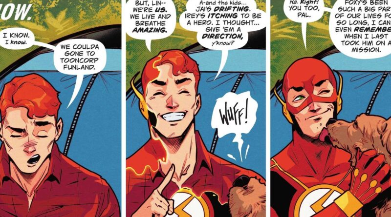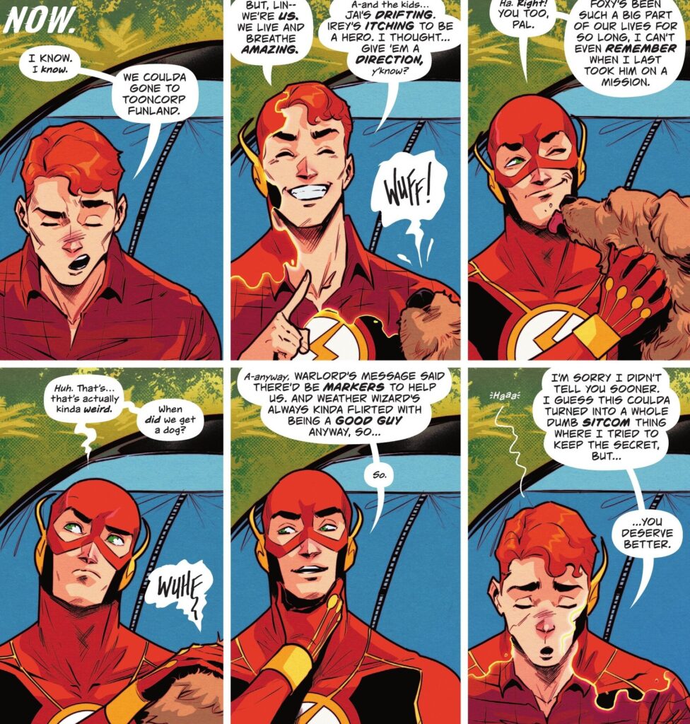 Najważniejsza zmiana w życiu Wally’ego w „DC All-In”? Nie kostium, a pies Foxy, którego zaprezentowano w „The Flash #14” z zeszłego tygodnia! Skąd się wziął Foxy? Nie pytajcie Wally’ego, nie pamięta.