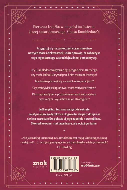 Na pierwszy rzut oka książka zachwyca wydaniem. Czerwona kolorystyka z subtelnymi złotymi napisami i zdobieniami nadaje jej dojrzały wygląd, ale jednocześnie zachowuje nutę magii, co świetnie pasuje do postaci Dumbledore’a. Twarda oprawa sprawia, że książka idealnie komponuje się na półce obok pozostałych tytułów związanych z Harrym Potterem.
