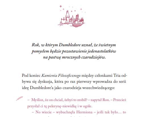 Wnętrze również nie zawodzi – co kilka stron pojawiają się drobne rysunki wpisujące się w magiczny świat J.K. Rowling, a różnorodne elementy typograficzne pomagają w odbiorze treści. Na przykład cytaty z książek wyróżniono czerwonym kolorem, a przytoczone myśli zapisano kursywą. Jedyne, co mi przeszkadzało, to złote zdobienia z odblaskowymi elementami na okładce – ścierają się wyjątkowo łatwo, nawet przy ostrożnym obchodzeniu się z książką. Wystarczyło lekko nacisnąć palcem, by złoty blask zniknął.