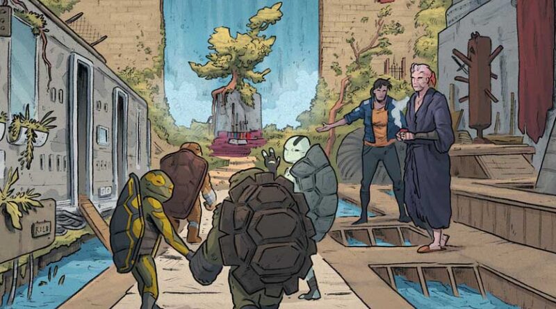 Druga historia koncentruje się na dorastaniu nowej generacji Żółwi i obserwowaniu, jak znani bohaterowie wchodzą w klasyczne role mentorów. To w gruncie rzeczy nieskomplikowana opowieść, która nie wnosi nic przełomowego, ale przypadła mi do gustu ze względu na optymistyczniejsze spojrzenie na świat po wydarzeniach z głównej serii. Problemem jest jednak sposób narracji – historia jest podawana fragmentarycznie, po kilka stron na rozdział, przez co brakuje przestrzeni na lepsze nakreślenie bohaterów i ich motywacji. Mimo to, ten wątek czyta się przyjemnie, ponieważ wprowadza ciepły, rodzinny klimat, pokazuje morały płynące z każdej przygody i ukazuje społeczeństwo oraz miasto w nowej perspektywie. Dzięki temu poznajemy elseworld z innej strony, co pozwala lepiej zrozumieć panujące w nim zasady.