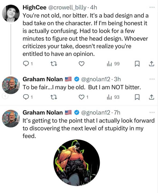 Sześć dni temu zaprezentowano wygląd Absolute Bane’a, który zadebiutuje w „Absolute Batman #9” w czerwcu. Reakcje fanów są podzielone — od entuzjazmu po krytykę. Negatywnie wypowiedział się także współtwórca postaci, Graham Nolan, któremu nie podoba się nowa interpretacja wizualna Bane’a powołując się na swoją zgorzkniałość i wiek.