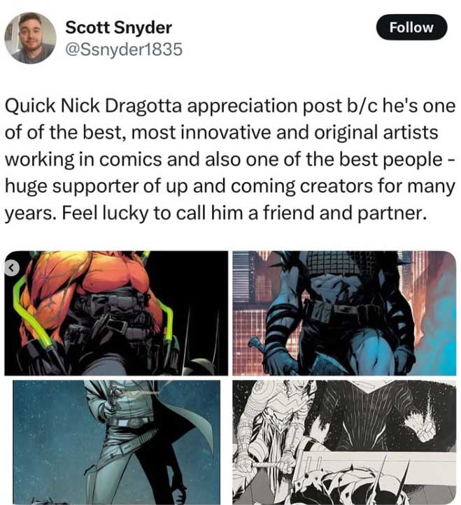 Na platformie X Scott Snyder wyraził wsparcie dla rysownika Nicka Dragotty, nie odnosząc się bezpośrednio do komentarza Nolana. Wpis Nolana zyskał ogromną popularność (ponad 1,6 mln wyświetleń), ale wywołał też falę krytyki, na którą Nolan odpowiedział, by zamiast atakować go za wyrażenie własnego zdania, fani wspierali komiksy kupując je i dzieląc się opiniami.