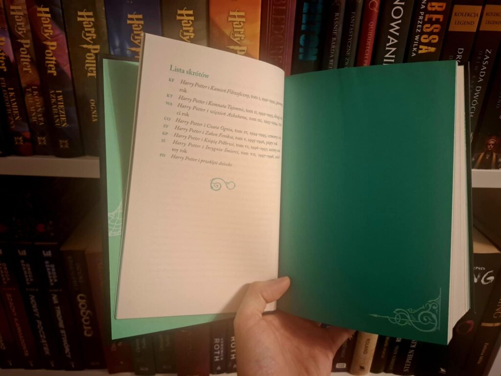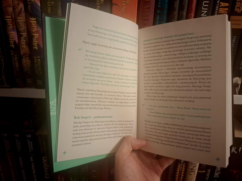 Pierwsze, co zwróciło moją uwagę, to piękne wydanie. Już sama okładka robi znakomite wrażenie: ciemna zieleń połączona ze srebrno-białymi napisami i zdobieniami idealnie oddaje klimat związany z korzeniami Snape’a, roztaczając aurę tajemnicy i powagi, cechy tak charakterystyczne dla mistrza eliksirów. Książka wydana jest w twardej oprawie, solidnie klejona, dzięki czemu nie rozpada się podczas czytania a przy tej objętości to naprawdę istotne. Bardzo praktycznym rozwiązaniem jest także matowe wykończenie napisów i ilustracji na okładce. Dzięki temu nic się nie ściera, w przeciwieństwie do wcześniejszej publikacji o Dumbledorze, gdzie złote litery znikały już po kilku lekturach. Środek prezentuje się równie dobrze: rozdziały są przejrzyste, przedzielane stylizowanymi wstawkami w zieleni, a dodatkowym atutem są cytaty z serii, które pojawiają się co chwilę. Budują klimat, urozmaicają lekturę i nadają książce atrakcyjności wizualnej. Jedynym minusem są przypisy, odwołania do konkretnych tomów nie mają wyjaśnień ani objaśnień na dole strony. Jeśli nie mamy książek pod ręką, trudno zweryfikować podawane informacje. Z jednej strony nie jest to konieczne, by zrozumieć tekst, ale z drugiej pozostawia lekki niedosyt i wytrąca z rytmu czytania.